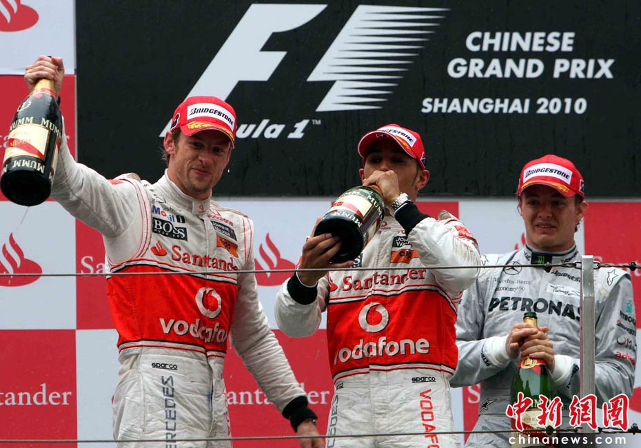 4月18日下午,2010國(guó)際汽聯(lián)F1世界錦標(biāo)賽上海站在上海國(guó)際賽車(chē)場(chǎng)舉行正式比賽,邁凱輪車(chē)隊(duì)的英國(guó)車(chē)手巴頓(左)在雨中獲得冠軍、隊(duì)友、英國(guó)車(chē)手漢密爾頓(中)獲得亞軍,梅賽德斯GP車(chē)隊(duì)的德國(guó)車(chē)手羅斯伯格獲得季軍。中新社記者 任晨鳴 攝