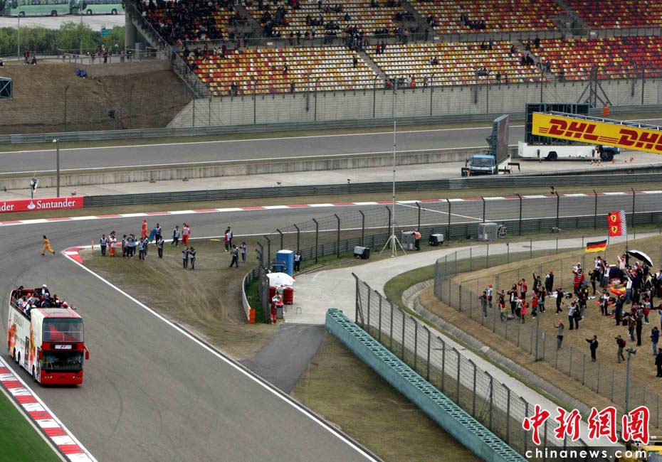 4月18日下午,2010國(guó)際汽聯(lián)F1世界錦標(biāo)賽上海站在上海國(guó)際賽車場(chǎng)舉行正式比賽,賽前24名參賽車手按照慣例乘坐敞篷車環(huán)繞賽場(chǎng)一周與車迷見面,但是寥寥無幾的觀眾與陰沉的天氣使上海F1賽事創(chuàng)下開賽七年以來觀眾人數(shù)最低的紀(jì)錄。中新社記者 任晨鳴 攝