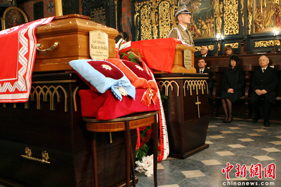 當(dāng)?shù)貢r(shí)間4月18日,卡欽斯基夫婦的葬禮在波蘭南部城市克拉科夫舉行。波蘭總統(tǒng)卡欽斯基及其夫人乘坐的專機(jī)10日在俄羅斯斯摩棱斯克失事,機(jī)上人員全部遇難。圖片來源:中國新聞網(wǎng)