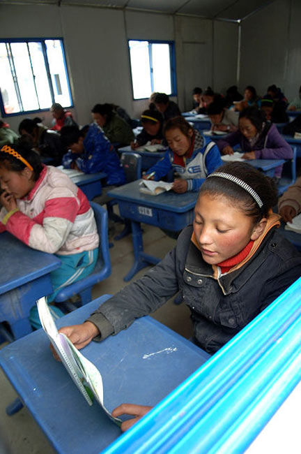 4月18日,70多名孩子在地震四天后重新走進了課堂,玉樹州孤兒學校成為了地震災區(qū)第一所復課的學校,剛完成帳篷搭建的青海省玉樹藏族自治州第一民族中學3個年級的學生也開始復課。圖片來源:新華網(wǎng)