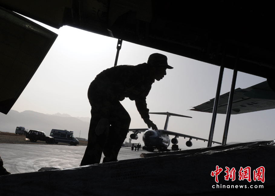 中國士兵正在空軍伊爾76重型運輸機上搬下救災帳篷,4月中旬以來他們連日在青海玉樹機場進行抗震救災工作。中新社發(fā) 賈國榮 攝