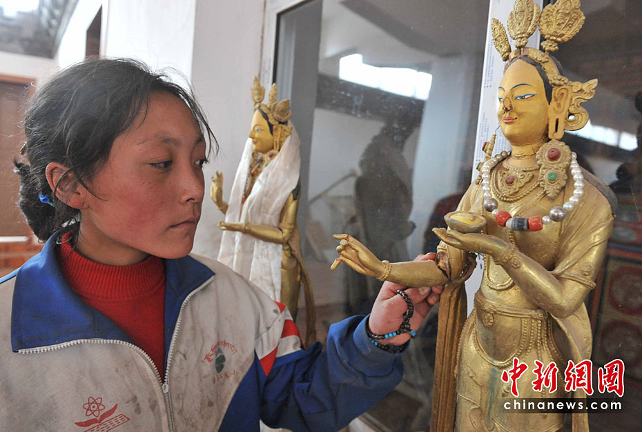 4月19日,新聞記者首次進(jìn)入青海玉樹7.1級強(qiáng)烈地震的震中點上拉秀鄉(xiāng)日麻村,奇跡是全村無一傷亡,位于村中心、正在新修的查榮寺里,兩尊文成公主的塑像局部損壞。中新社發(fā) 賈國榮 攝