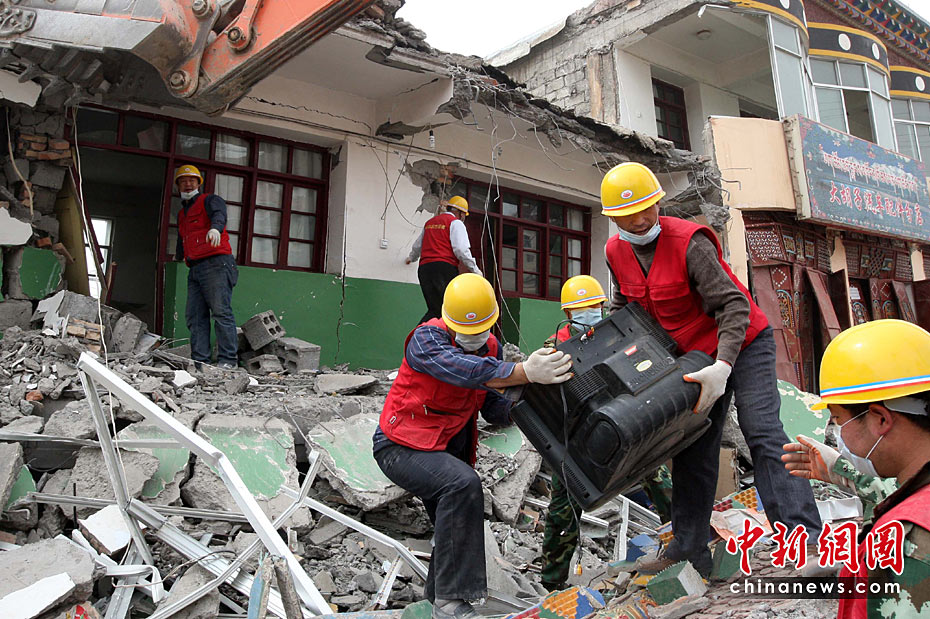 2010年4月19日,青海省玉樹縣結(jié)古鎮(zhèn),一隊(duì)唐山農(nóng)民志愿者為受災(zāi)民眾在廢墟中搜尋他們的財(cái)物。他們?cè)?jīng)參加過汶川地震救援工作。中新社發(fā) 盛佳鵬 攝