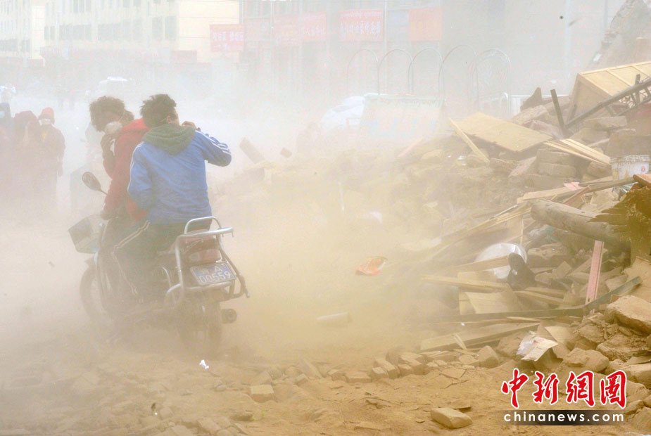 4月中旬青海玉樹地震災(zāi)區(qū)風沙迷漫,結(jié)古鎮(zhèn)受災(zāi)民眾在風塵滾滾中艱難出行。中新社發(fā) 賈國榮 攝
