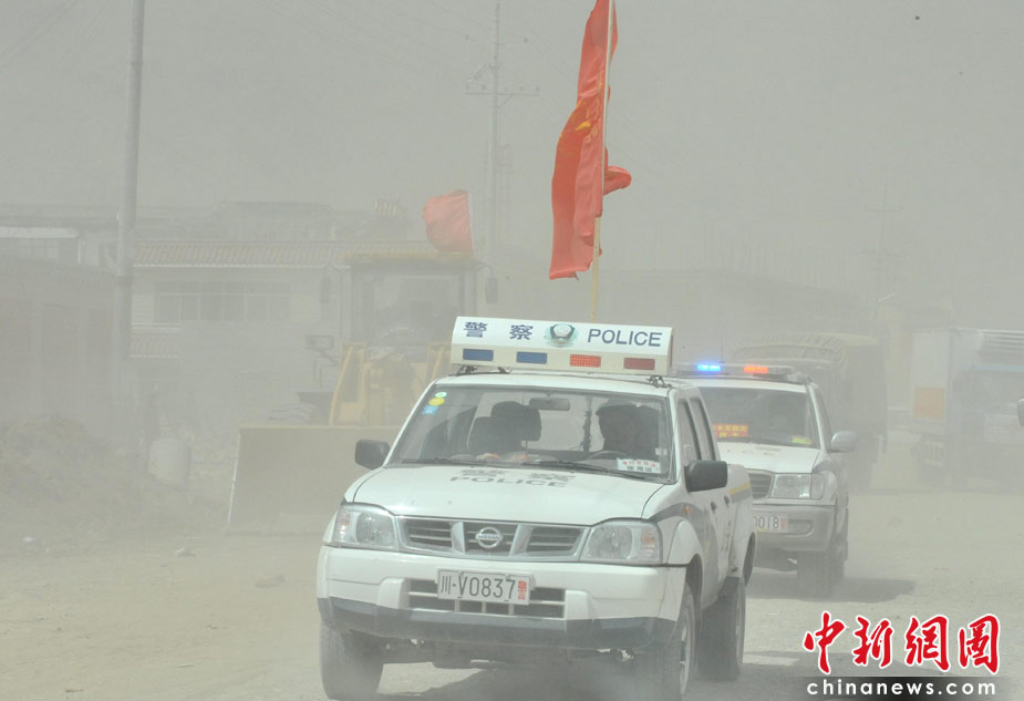 4月中旬青海玉樹(shù)地震災(zāi)區(qū)風(fēng)沙迷漫,警車(chē)在結(jié)古鎮(zhèn)災(zāi)區(qū)風(fēng)煙滾滾中艱難穿行。中新社發(fā) 賈國(guó)榮 攝