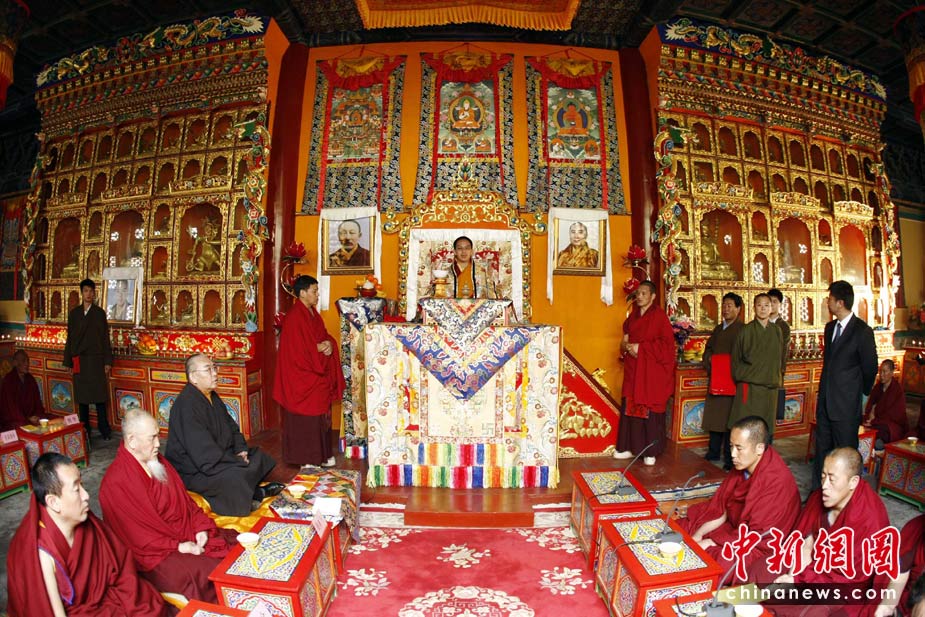 4月20日上午9時(shí)許,十一世班禪額爾德尼·確吉杰布在北京西黃寺,為青海玉樹地震遇難同胞舉行超度法會(huì)。中新社發(fā) 杜洋 攝