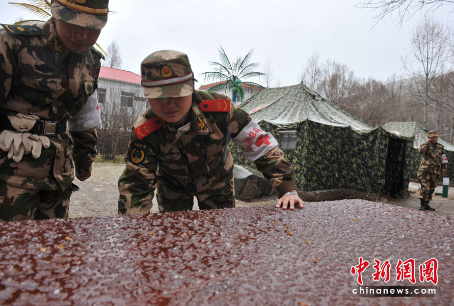 4月20日12時許,玉樹地震災(zāi)區(qū)突然雷雹交加,給青海武警總隊醫(yī)療救護(hù)隊治療抗震救災(zāi)傷員造成困難。中新社發(fā) 賈國榮 攝