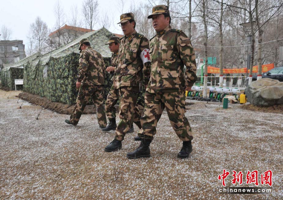 4月20日12時(shí)許,玉樹地震災(zāi)區(qū)突然雷雹交加,青海武警總隊(duì)醫(yī)療救護(hù)隊(duì)帳篷前一片雪白,軍醫(yī)立刻商量救護(hù)對(duì)策。中新社發(fā) 賈國(guó)榮 攝