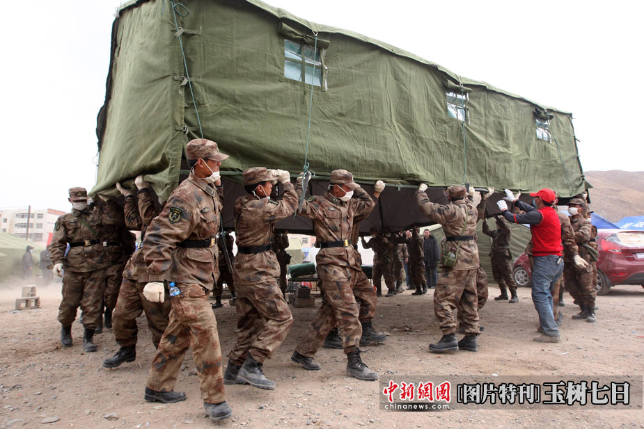 4月17日,青海玉樹體育場受災(zāi)民眾安置點(diǎn)內(nèi),解放軍救援隊(duì)為安置點(diǎn)整體搬遷帳篷。中新社發(fā) 盛佳鵬 攝