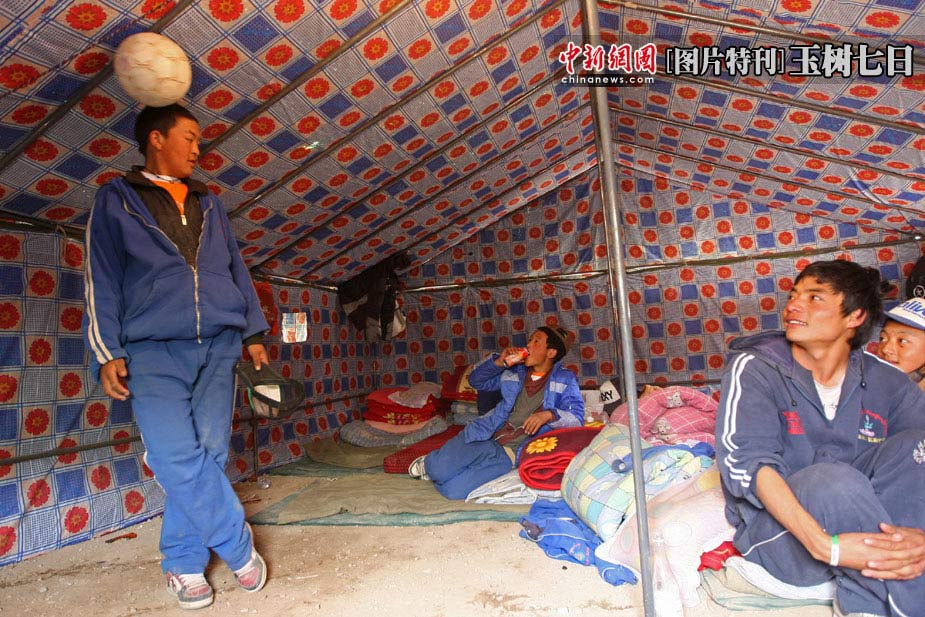 2010年4月19日,青海玉樹縣結(jié)古鎮(zhèn)玉樹縣第一民族中學的學生宿舍帳篷內(nèi),德尕扎西(左)在其他同學面前表演球技,稱自己是“C羅”。中新社發(fā) 盛佳鵬 攝