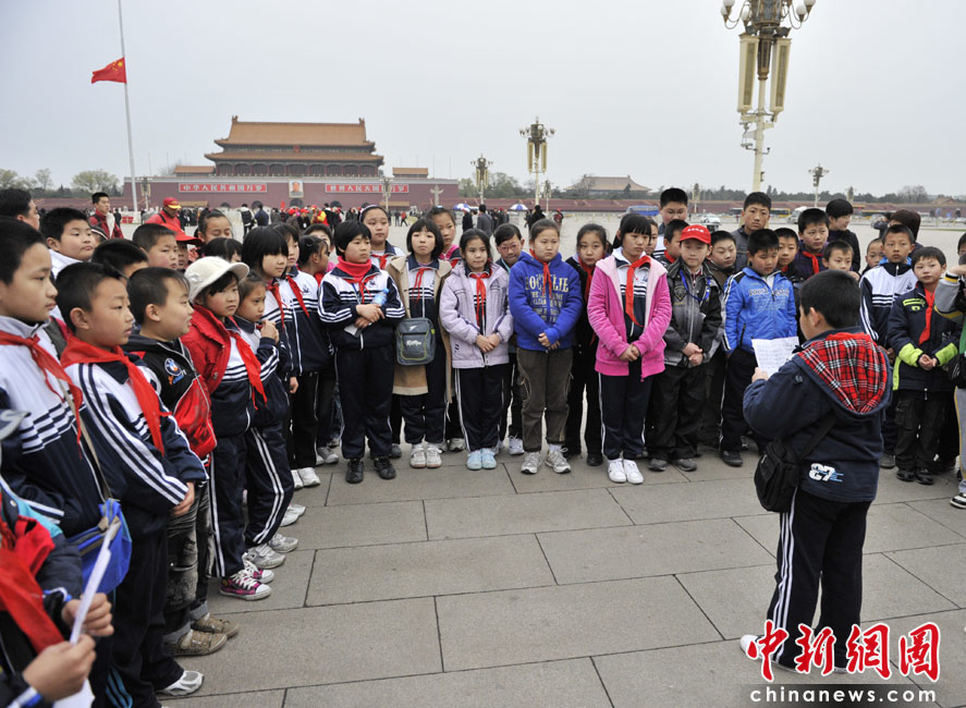 4月21日清晨,廊坊第十二小學(xué)的小學(xué)生來(lái)到天安門廣場(chǎng)朗讀自己的作文悼念青海玉樹(shù)地震的遇難同胞。中新網(wǎng)記者 金碩 攝