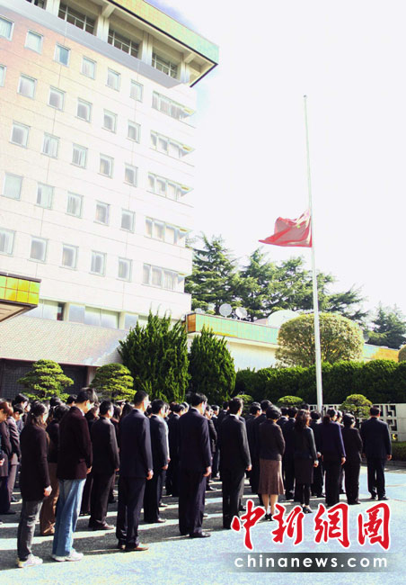 4月21日,按照中國(guó)國(guó)務(wù)院決定,舉行全國(guó)哀悼活動(dòng),全國(guó)和駐外使領(lǐng)館下半旗志哀,停止公共娛樂(lè)活動(dòng)。圖為中國(guó)駐日本大使館集結(jié)全館館員,進(jìn)行降半旗默哀紀(jì)念活動(dòng)。中新社發(fā) 孫冉 攝