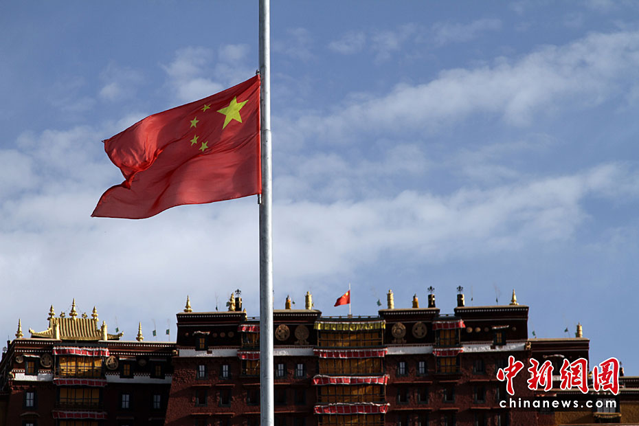 4月21日,西藏布達(dá)拉宮廣場(chǎng)上舉行降半旗儀式。同時(shí),布達(dá)拉宮紅宮頂端的紅旗也降半旗,向青海玉樹地震遇難者志哀。中新社發(fā) 徐長(zhǎng)安 攝