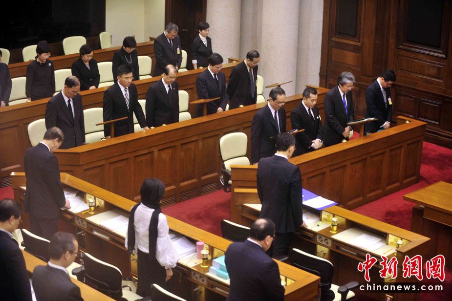 香港立法會(huì)4月21日繼續(xù)辯論財(cái)政預(yù)算案撥款條例草案,立法會(huì)主席曾鈺成在預(yù)算案辯論開始前,帶領(lǐng)全體議員及與會(huì)官員一同肅立,為青海地震死難者默哀。中新社發(fā) 譚達(dá)明 攝