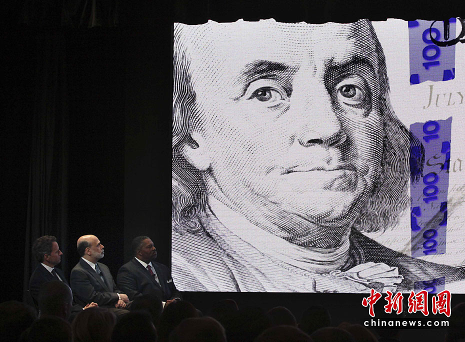 4月21日,美國(guó)財(cái)政部和美聯(lián)儲(chǔ)共同發(fā)布新版100美元面值的紙幣票樣。此次發(fā)行新版百元美鈔旨在防范假鈔,同時(shí),老版美元仍將繼續(xù)流通。圖片來源:中國(guó)新聞網(wǎng)