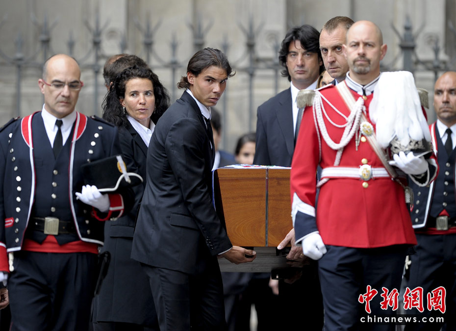 西班牙當?shù)貢r間4月22日18時,國際奧委會終身名譽主席薩馬蘭奇的葬禮在巴塞羅那舉行,包括西班牙國王夫婦、現(xiàn)任國際奧委會主席羅格、F1車手阿隆索、巴薩俱樂部主席等在內(nèi)的政界和體育界4000多人出席,網(wǎng)球名將納達爾等負責抬靈柩,送別薩翁最后一程。 圖為西班牙網(wǎng)球明星納達爾忍悲痛抬棺木。