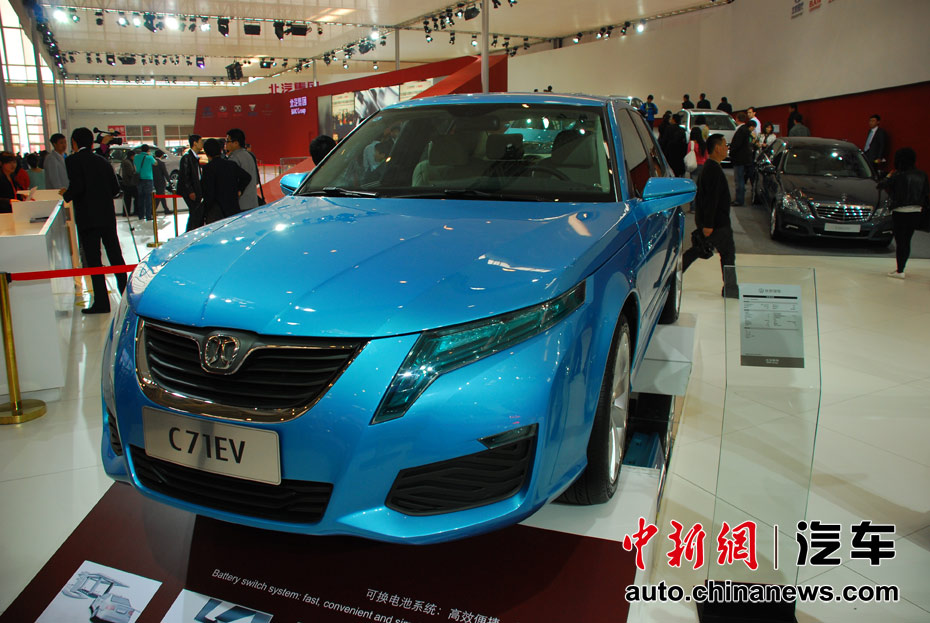 第十一屆北京國(guó)際車展23日開(kāi)幕,在本屆以“暢想綠色未來(lái)”為主題的車展上,新能源車成為最大亮點(diǎn)。圖為北汽C71EV電動(dòng)車 王槊 攝