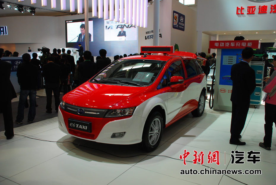 第十一屆北京國際車展23日開幕,在本屆以“暢想綠色未來”為主題的車展上,新能源車成為最大亮點(diǎn)。圖為比亞迪E6電動出租車 王槊 攝