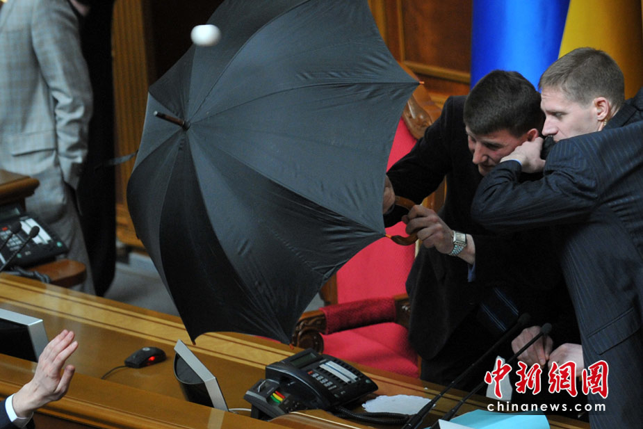 4月27日,基輔,烏克蘭議會就俄羅斯黑海艦隊駐扎問題進行討論時出現(xiàn)混亂,數(shù)千人在議會外示威,會場內有人投擲煙霧彈和雞蛋,大廳內煙霧彌漫,場面一度混亂。圖為議長藏在傘后躲避不斷飛來的雞蛋。