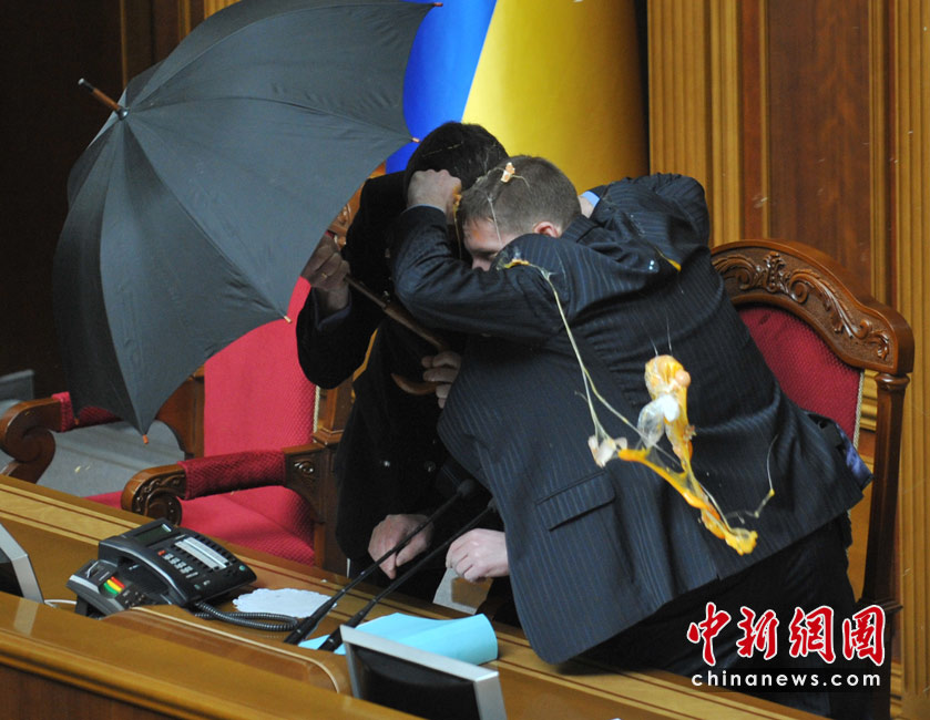 4月27日,基輔,烏克蘭議會(huì)就俄羅斯黑海艦隊(duì)駐扎問(wèn)題進(jìn)行討論時(shí)出現(xiàn)混亂,數(shù)千人在議會(huì)外示威,會(huì)場(chǎng)內(nèi)有人投擲煙霧彈和雞蛋,大廳內(nèi)煙霧彌漫,場(chǎng)面一度混亂。圖為議長(zhǎng)藏在傘后躲避不斷飛來(lái)的雞蛋。