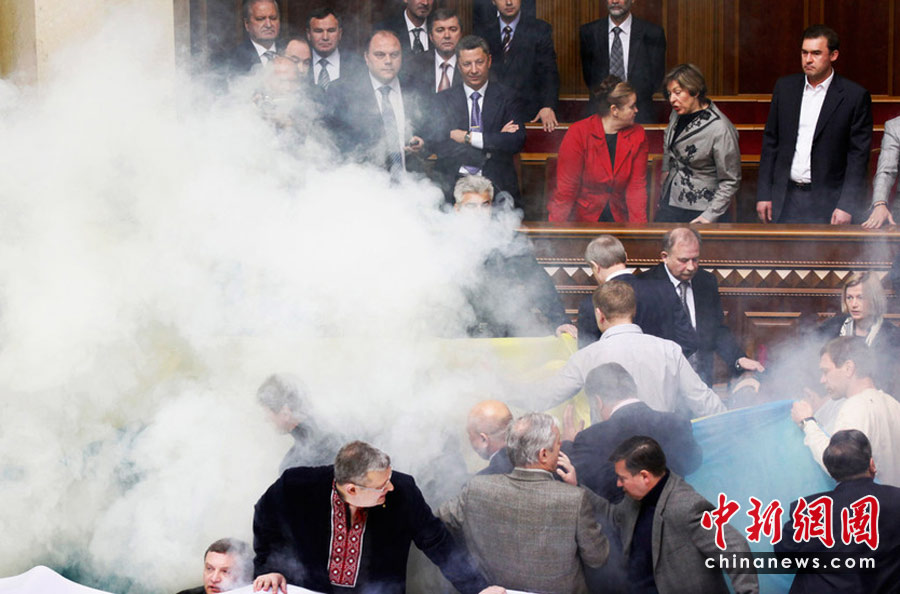 4月27日,基輔,烏克蘭議會就俄羅斯黑海艦隊駐扎問題進行討論時出現(xiàn)混亂,數(shù)千人在議會外示威,會場內(nèi)有人投擲煙霧彈和雞蛋,大廳內(nèi)煙霧彌漫,場面一度混亂。