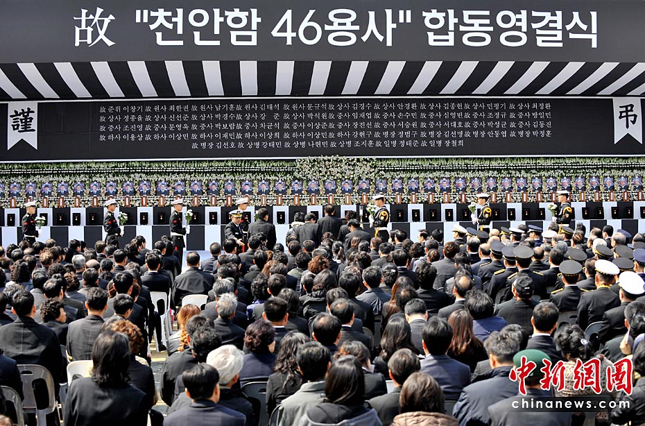 4月29日上午,韓國“天安”艦遇難官兵遺體告別儀式在平澤海軍第二艦隊司令部安保公園舉行。韓國總統(tǒng)李明博攜夫人參加告別儀式。圖片來源:中國新聞網(wǎng)