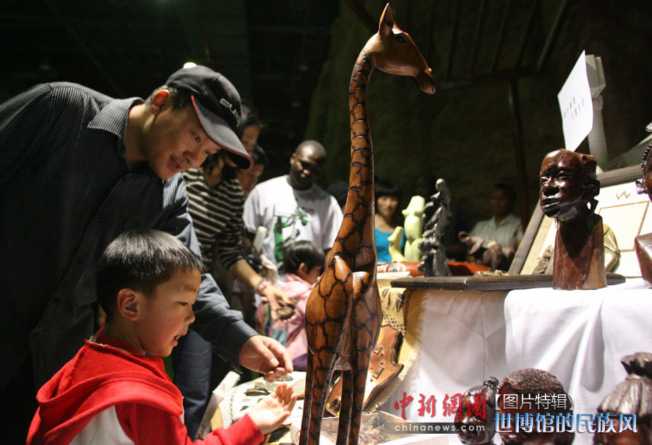 5月1日,上海世博會開園第一天,非洲聯(lián)合館內(nèi)陳設(shè)的工藝品吸引了一對父子游客。中新社發(fā) 蘇丹 攝
