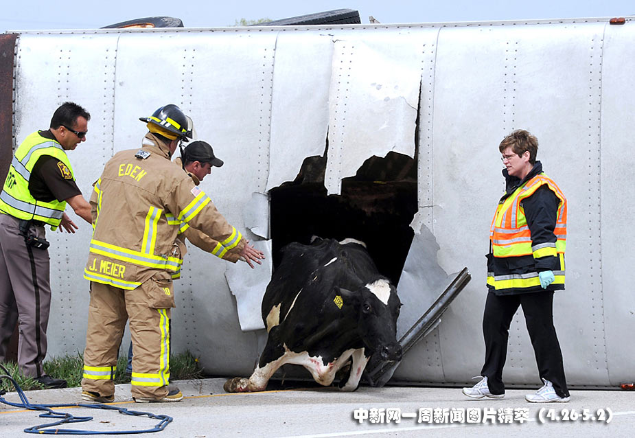 29日(周四),一輛運送奶牛的卡車在威斯康星洲公路上發(fā)生事故。