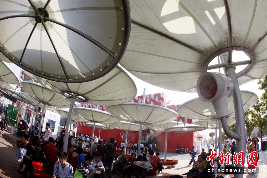 2010年5月2日,上海世博園區(qū)啟動各項控溫降溫設施應對高溫。圖為游客休息區(qū)內啟動噴霧降溫系統(tǒng)。中新社記者 盛佳鵬 攝