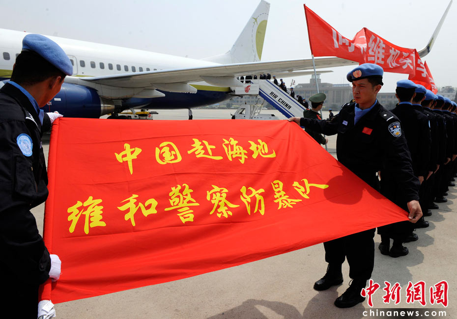 5月4日,中國第八支赴海地維和警察防暴隊全體隊員乘坐聯(lián)合國包機返回祖國。公安部副部長孟宏偉、政治部主任蔡安季前往機場迎接。 中新社發(fā) 劉震 攝