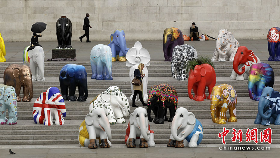 5月4日,2010年倫敦大象游行活動(dòng)當(dāng)日在特拉法爾加廣場(chǎng)啟動(dòng)。260個(gè)真象大小的彩繪雕塑將在倫敦各處展出,并將于6月30日拍賣(mài)為慈善組織籌款。圖片來(lái)源:中國(guó)新聞網(wǎng)