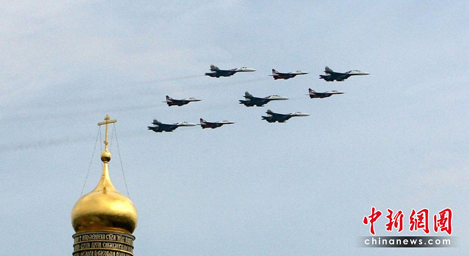 當?shù)貢r間5月4日,在俄羅斯首都莫斯科,參加彩排的戰(zhàn)機編隊飛過紅場上空。俄羅斯將于5月9日隆重紀念衛(wèi)國戰(zhàn)爭勝利65周年。圖片來源:中國新聞網(wǎng)