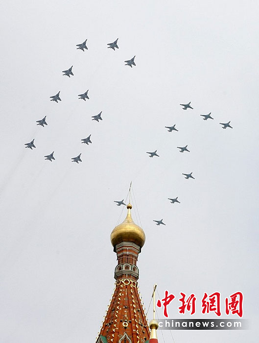 當(dāng)?shù)貢r間5月4日,在俄羅斯首都莫斯科,參加彩排的戰(zhàn)機編隊飛過紅場上空。俄羅斯將于5月9日隆重紀念衛(wèi)國戰(zhàn)爭勝利65周年。圖片來源:中國新聞網(wǎng)