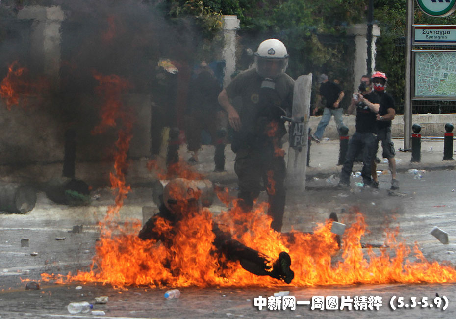 5月5日周三,在雅典舉行的反對(duì)大幅削減開支的抗議活動(dòng)中, 一名防暴警察被困在火焰彈引發(fā)的團(tuán)團(tuán)火焰中。