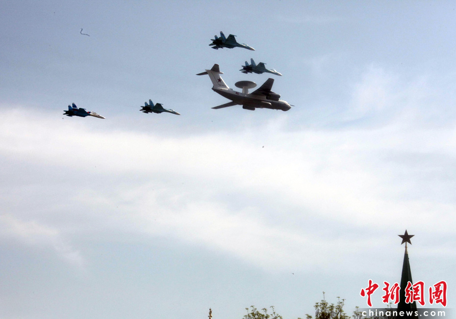5月9日,俄羅斯在莫斯科紅場(chǎng)舉行盛大的閱兵式,慶祝衛(wèi)國(guó)戰(zhàn)爭(zhēng)勝利65周年。莫斯科時(shí)間5月9日上午10點(diǎn)(北京時(shí)間9日下午2點(diǎn))許,閱兵式正式開始。2--圖為空中梯隊(duì)穿越紅場(chǎng)上空接受檢閱。張朔 攝
