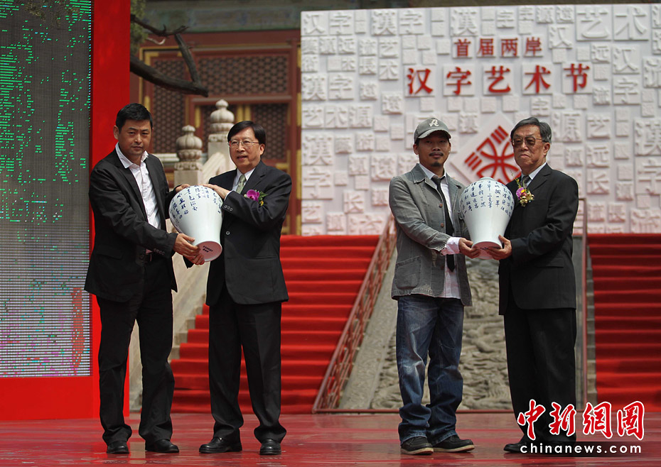 5月15日,首屆“兩岸漢字藝術節(jié)”新聞發(fā)布會在北京孔廟舉行。原文化部長、著名作家王蒙與臺灣文化總會會長劉兆玄等共同書寫漢字——“漢字藝術源遠流長”。 中新社發(fā) 蘇丹 攝