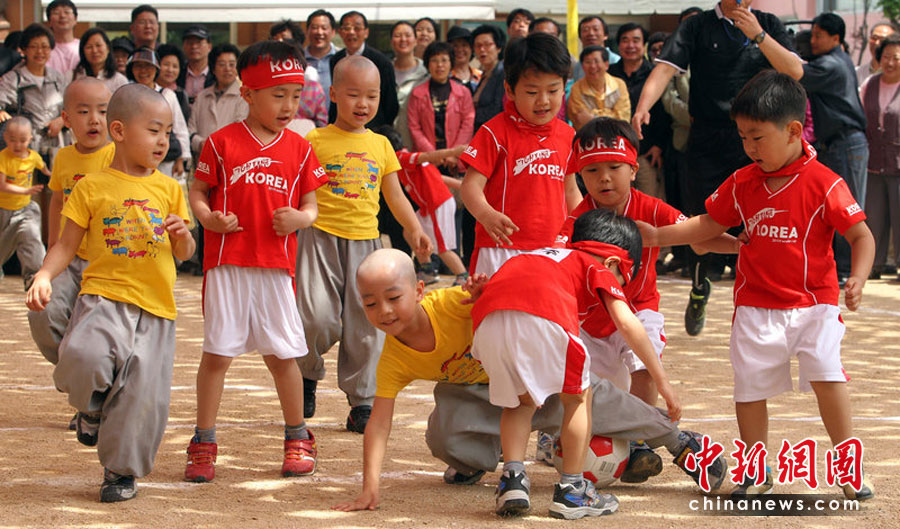 2010年5月15日,韓國首爾曹溪寺院舉行了兒童足球賽,一群四五歲的孩子和小和尚參加了這場足球友誼賽。這場比賽是佛誕節(jié)活動的一部分,也是為了迎接2010世界杯足球賽的到來。Chung Sung-Jun (圖片來源:CFP)