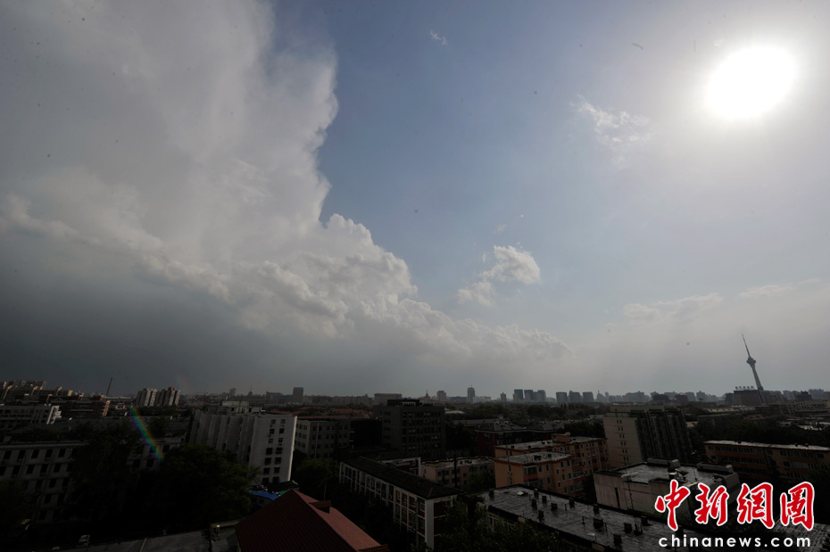 5月18日16時許,伴隨陣陣?yán)茁暰┏峭唤荡笥,降雨過后東部天空仍籠罩著密布的烏云,而此時西邊則出現(xiàn)了落日。中新網(wǎng)記者 金碩 攝