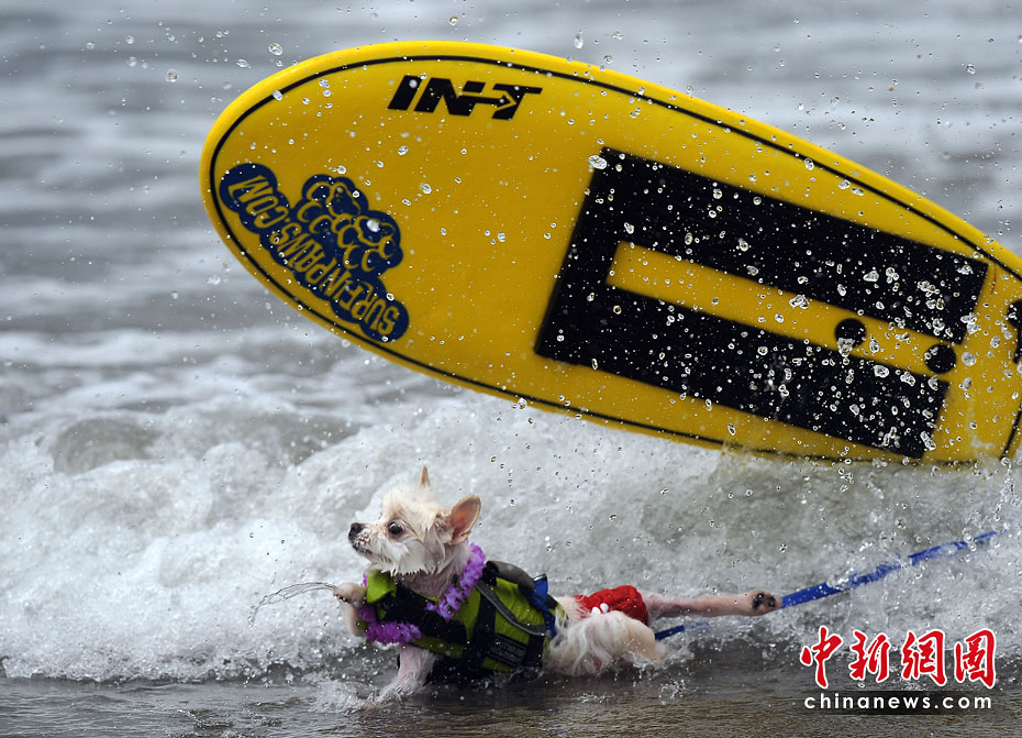 5月22日,美國(guó)加利福尼亞州圣迭戈舉行了一場(chǎng)妙趣橫生的狗狗沖浪比賽。圖片來(lái)源:中國(guó)新聞網(wǎng)
