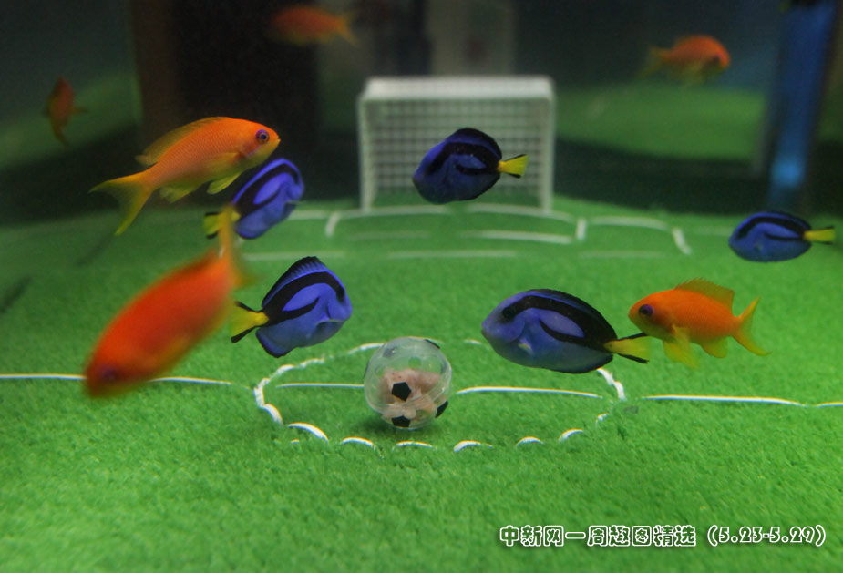 5月23日,日本橫濱八景島海洋世界水族館中,一群魚兒在“踢足球”,藍色魚代表日本隊,橘色魚代表荷蘭隊。在2010年南非“世界杯”上,日本將迎戰(zhàn)荷蘭隊。 圖片來源:中國新聞網(wǎng)>>點擊觀看詳細(xì)內(nèi)容