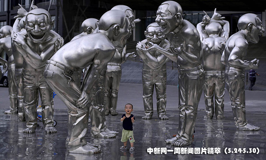 26日(周三),北京,一名小童在北京今日美術(shù)館的雕塑前玩耍。