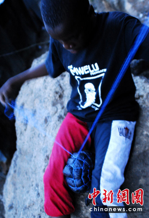生活在肯尼亞首都內(nèi)羅畢(Nairobi) Muthare難民營的小孩兒沒有能力買足球、足球鞋,更別說專業(yè)足球隊(duì)員穿的成套的球衣了。但是這些沒有給他們對(duì)足球運(yùn)動(dòng)的喜愛產(chǎn)生任何影響。孩子們從當(dāng)?shù)氐睦褤靵硭芰峡诖退芰纤槠,自己?dòng)手做“足球”。 圖片來源:CFP