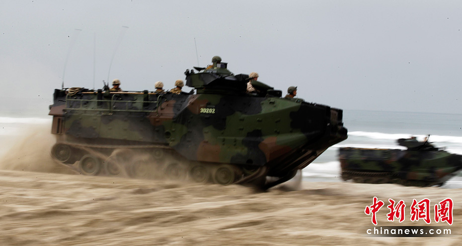 當?shù)貢r間6月4日,約5000名水兵和陸戰(zhàn)隊員在美國加利福尼亞州舉行了代號為“黎明突擊”的搶灘登陸軍事演習。圖片來源:中國新聞網(wǎng)