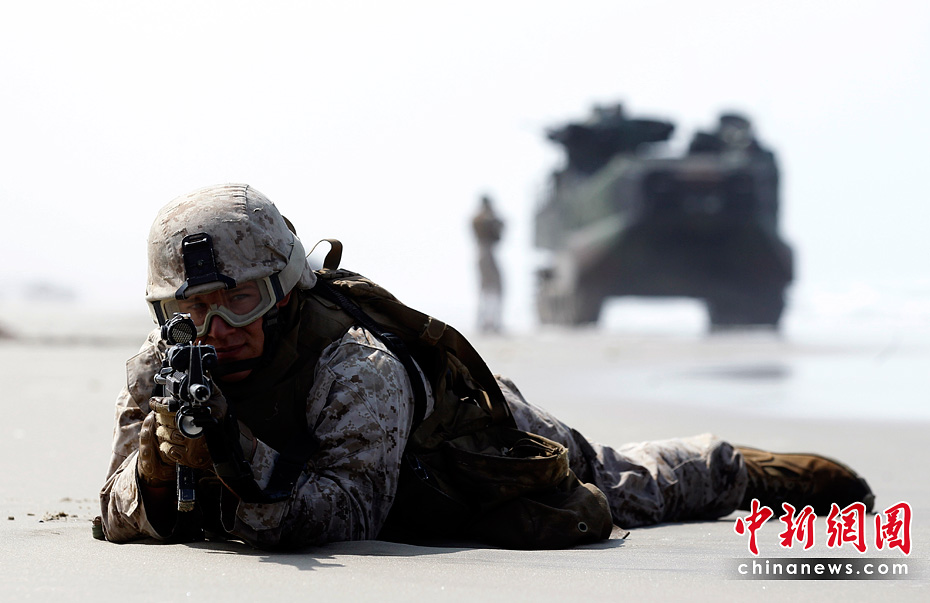當(dāng)?shù)貢r(shí)間6月4日,約5000名水兵和陸戰(zhàn)隊(duì)員在美國加利福尼亞州舉行了代號為“黎明突擊”的搶灘登陸軍事演習(xí)。圖片來源:中國新聞網(wǎng)