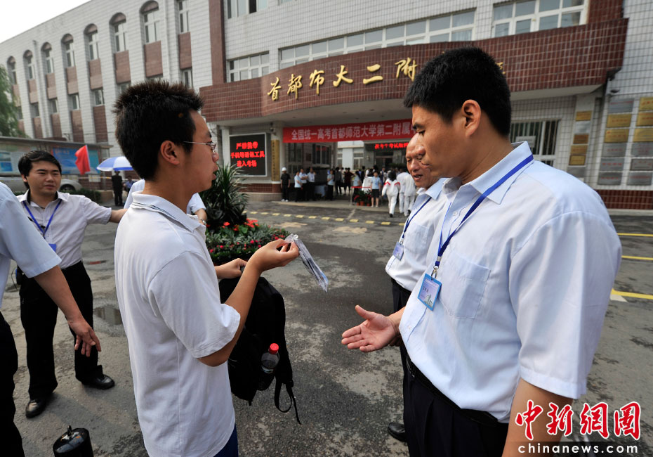 2010年全國高考6月7日日拉開大幕,957萬考生走進考場。由于報名人數(shù)減少,而招生計劃增加,教育部預(yù)計今年全國高考平均錄取率將會增加近7%。圖為首都師范大學(xué)第二附屬中學(xué)考點。中新網(wǎng)記者 金碩 攝