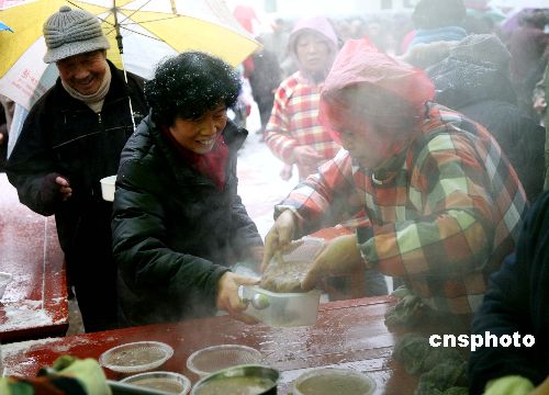 1月15日,南京市民排隊領取毗盧寺派送的臘八粥。當日是中國傳統(tǒng)的“臘八節(jié)”,民間有喝臘八粥的習俗,南京名剎毗盧寺免費向市民提供28888份臘八粥,吸引了眾多市民排長隊領取。據(jù)了解,毗盧寺當天免費提供的臘八粥,是由紅豆、花生米等38種原料用微火熬制而成,其中僅糯米就有2888斤。中新社發(fā) 鐘山 攝