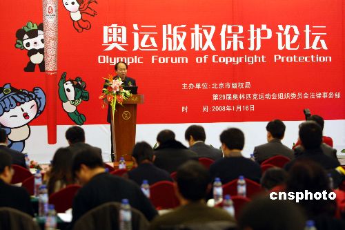 一月十六日,由北京市版權(quán)局、北京奧組委共同組織的“奧運(yùn)版權(quán)保護(hù)論壇”在北京舉行。這是新年伊始,由政府管理部門組織的第一個(gè)以奧運(yùn)版權(quán)保護(hù)為主題的大型宣傳活動(dòng)。中新社發(fā) 任海霞 攝