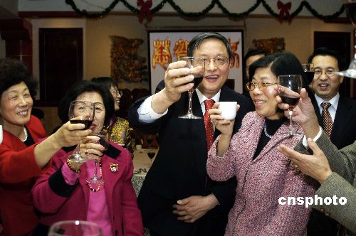 中國駐美大使周文重(中)及夫人謝淑敏女士(左一)和駐美使館領(lǐng)事部全體外交官1月26日來到華盛頓特區(qū)唐人街,向大華府地區(qū)各僑社領(lǐng)袖拜年。圖為周文重大使向僑領(lǐng)敬酒。中新社發(fā) 邱江波 攝