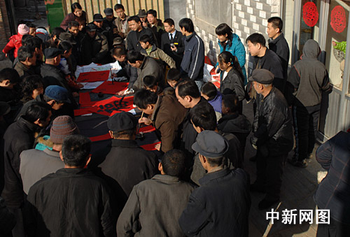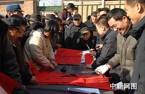 1月31日,河北滄州市部分書法家、企業(yè)家來到“感動中國支教模范”白芳禮的家鄉(xiāng)滄縣白賈村,為鄉(xiāng)親們書寫春聯(lián)。王少華 攝