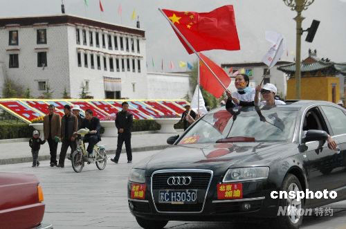 圖:網(wǎng)友自發(fā)組織的奧運助威車隊駛過拉薩布達拉宮